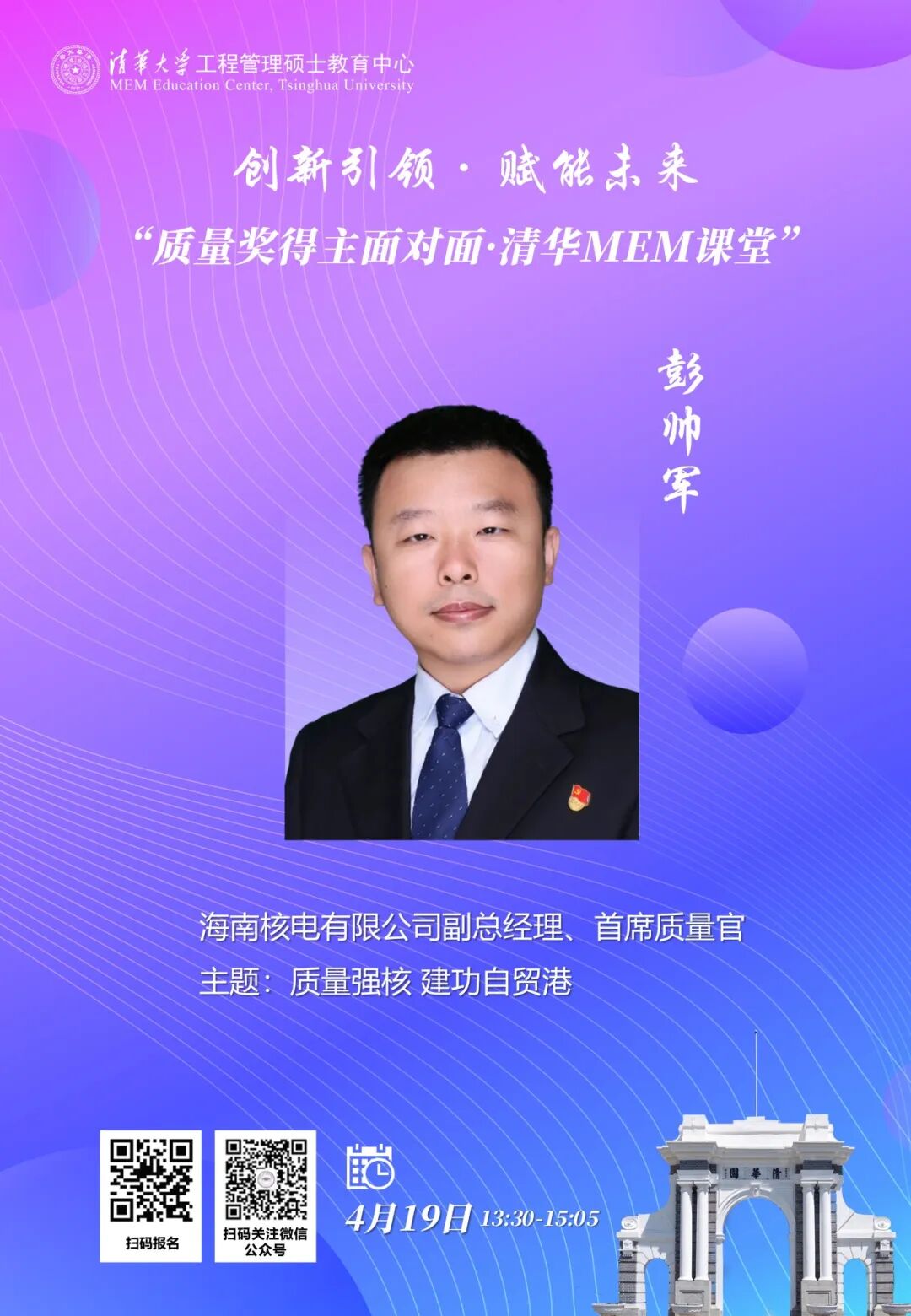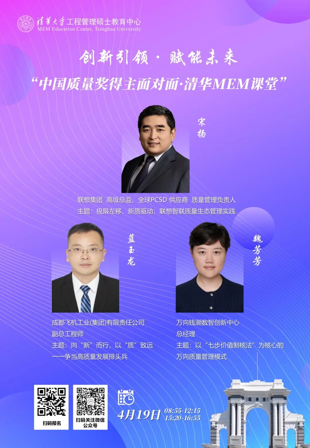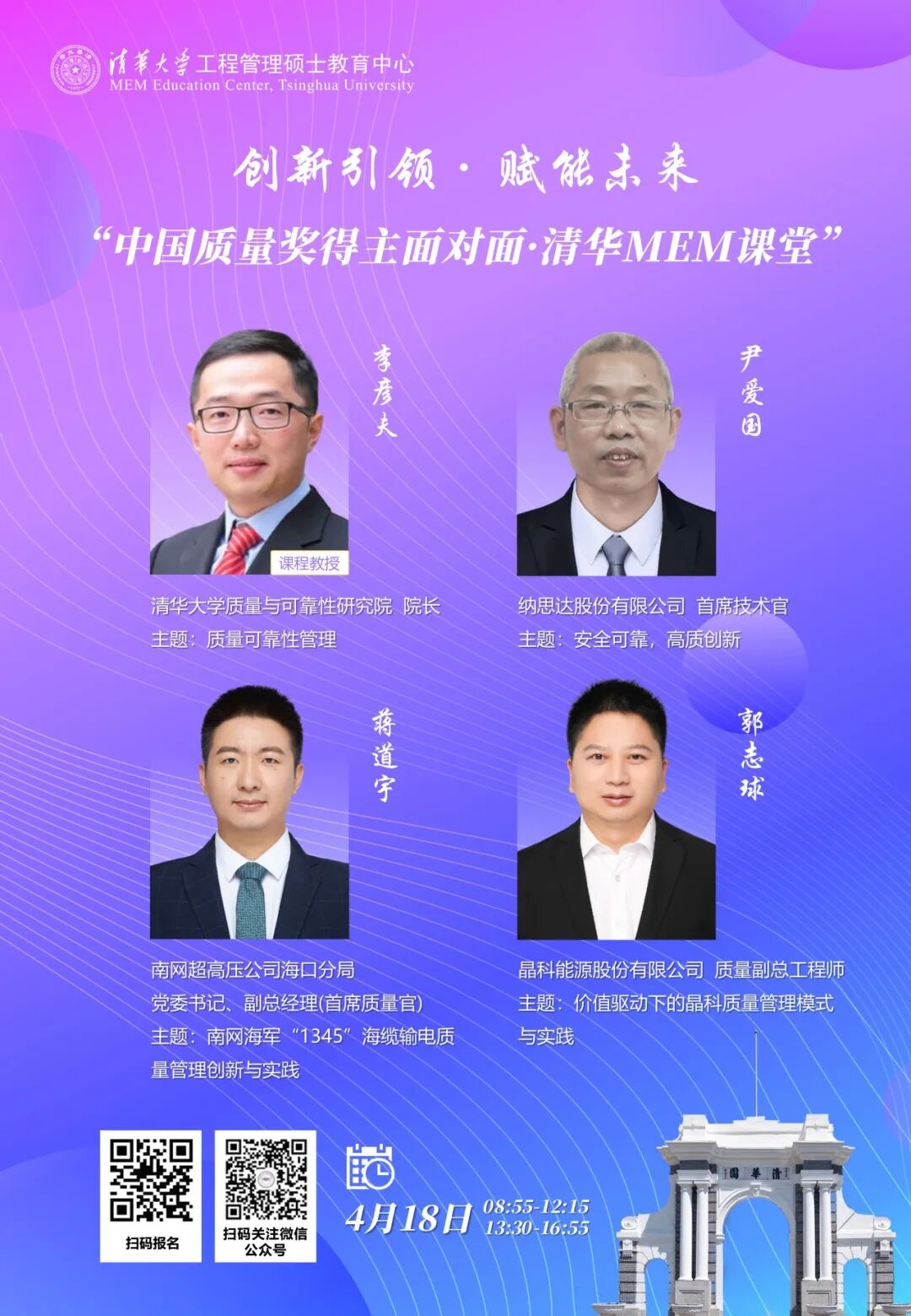 4月18日至19日,“中国质量奖得主面对面・清华MEM课堂”将在清华园举行。本次活动邀请多家获奖企业的首席质量官,围绕质量管理创新与实践进行专题分享。